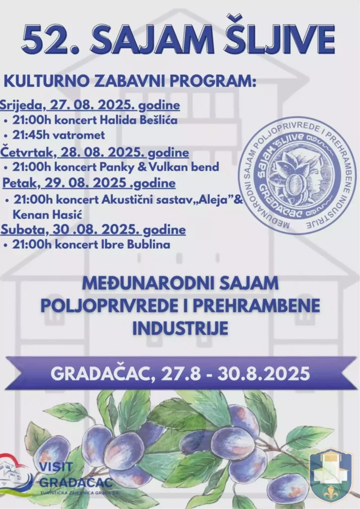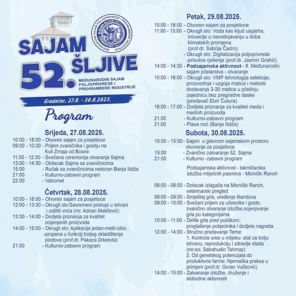 Ovogodišnje 52. izdanje Međunarodnog sajma poljoprivrede i prehrambene industrije bit će održano u periodu od 27– 30. avgusta 2025. godine u Gradačcu. Kao i svake godine osim izložbenog prostora za posjetioce, održat će se niz stručnih i okruglih stolova o savremenim tokovima u oblasti poljoprivrede i voćarstava. I ove godine bit će dodijeljena priznanja od strane stručnih komisija za kvalitet proizvoda koji će se predstaviti na sajamsko izložbenom dijelu.